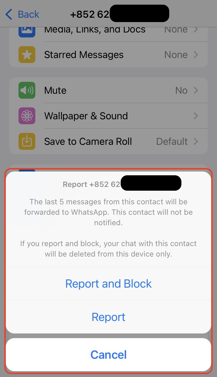 如果你認為這位聯絡人非常可疑,並且所傳送的訊息是滋擾訊息或垃圾訊息,便可以向 WhatsApp 舉報這個帳號。